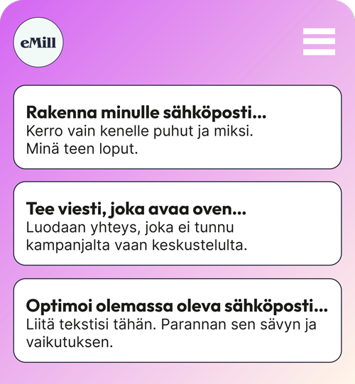 Sinä kerrot tavoitteesi, eMill tekee loput: kirjoittaa viestit, rakentaa kampanjan rungon ja ehdottaa aiheita, jotka pitävät yleisösi aktiivisena.